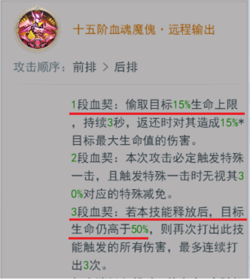 总结:提高进场爆发和强制魂契消耗,保底三段最高五段,魔傀的伤害始终稳定在中等偏上,在最短的时间里,把伤害量和魂契的附加效果拉到最高。